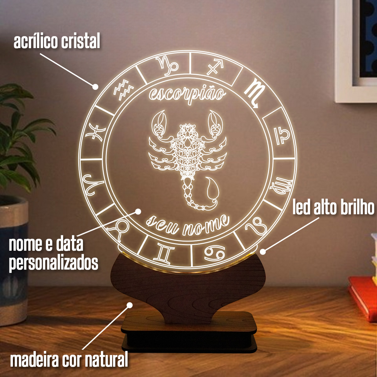 Energize seu ambiente! A luminária é produzida em acrílico cristal de alta pureza, com base em madeira MDF. Possui acabamentos simétricos garantindo a qualidade, produzidos a laser. Além de ser uma excelente peça decorativa para compor qualquer local, deixando o ambiente muito mais bonito e aconchegante, possui ótima iluminação para ser usada como abajur, luminária de mesa e também para leituras noturnas. São excelentes opções para presentear.