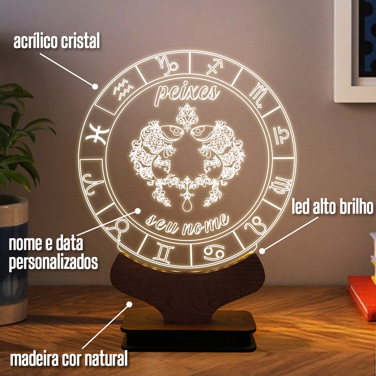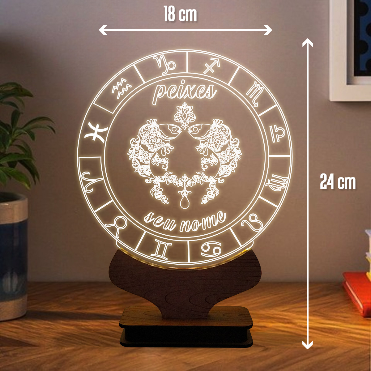 Energize seu ambiente! A luminária é produzida em acrílico cristal de alta pureza, com base em madeira MDF. Possui acabamentos simétricos garantindo a qualidade, produzidos a laser. Além de ser uma excelente peça decorativa para compor qualquer local, deixando o ambiente muito mais bonito e aconchegante, possui ótima iluminação para ser usada como abajur, luminária de mesa e também para leituras noturnas. São excelentes opções para presentear.