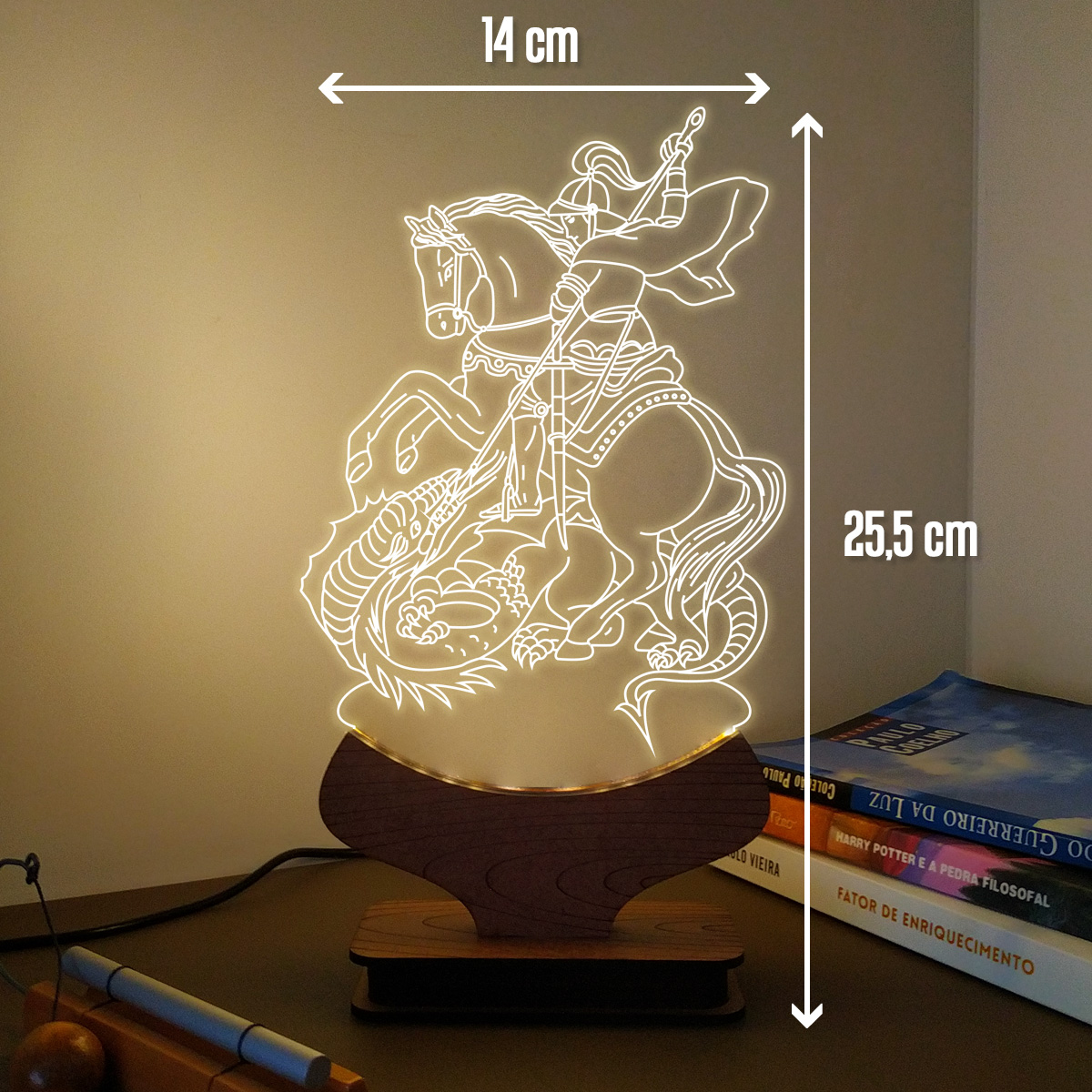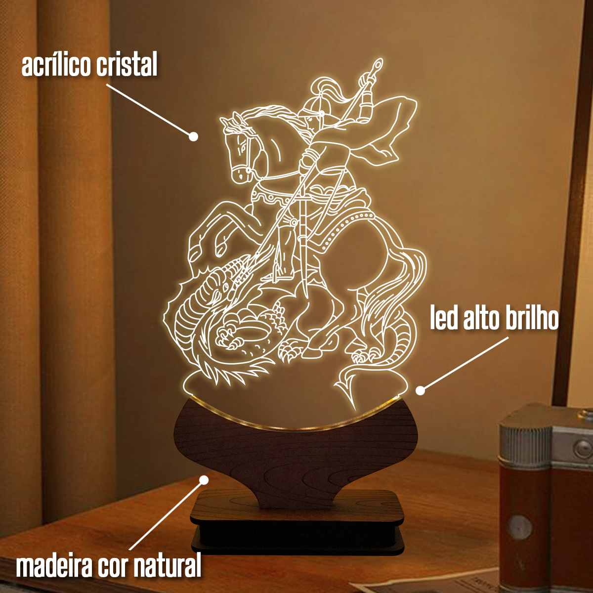 Com sua luz suave e quente, essa luminária pode criar um ambiente acolhedor e confortável para momentos de oração e reflexão. E com a imagem de São Jorge gravada com cuidado na luminária, você pode se sentir cercado pela proteção e orientação do santo guerreiro.